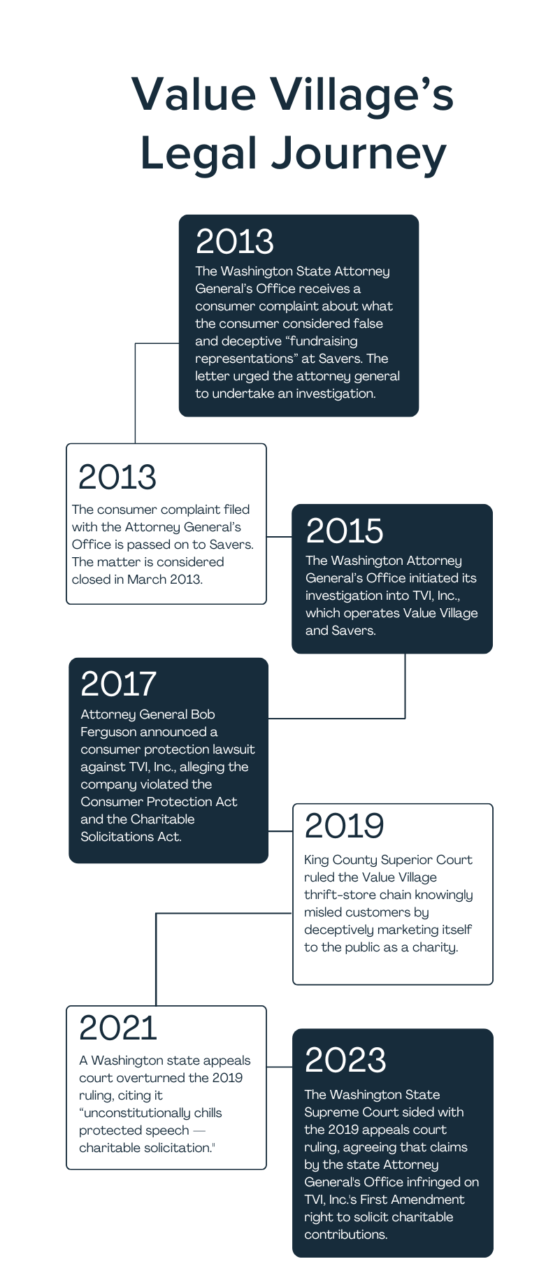 In 2017, Attorney General Bob Ferguson first filed charges against the company, claiming that it had deceived thousands of Washington consumers and donors for more than a decade, in violation of state law, with an aggressive marketing campaign that created the impression that Value Village itself was a nonprofit or charity, “hiding its for-profit status behind a veneer of charitable goodwill.”