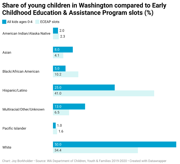 According to a 2019 survey by Elway Research, in 60% of Washington households with children younger than age 6, all available parents had paying jobs. This meant more than 300,000 children needed care. At that time, child care capacity in the state for kids from infants to age 12 was about 186,000. In Federal Way, south of Seattle, Heavner spent months on waiting lists for child care. While the need for affordable, accessible child care is broad, children of color are in particular need of support. They make up 50% of kids younger than school age in Washington, but they comprise about 65% of kids who participate in subsidized child care and in the Early Childhood Education and Assistance Program, which is government-provided preschool.