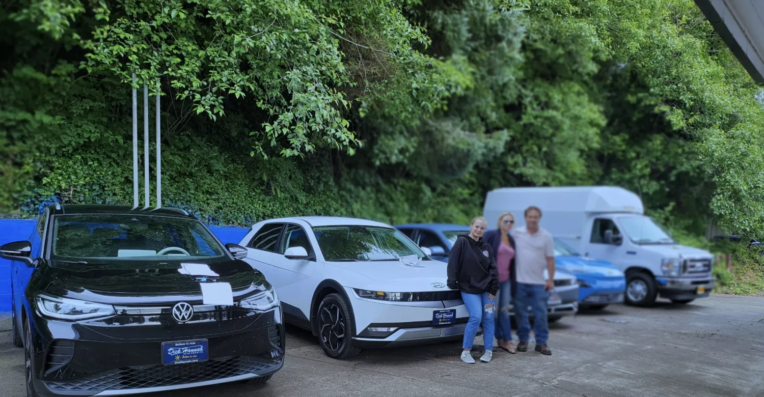 Merlin Thompson told DEQ the vehicles he bought with the carbon credit money were for his company. He sent the agency this photo of five new electric vehicles he bought after receiving the money. Credit: Oregon Department of Environmental Quality