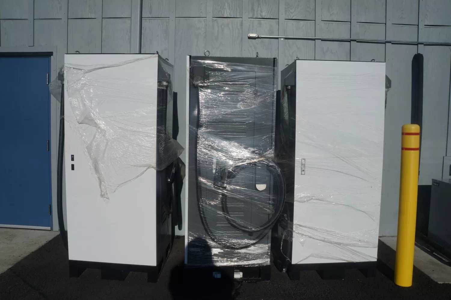 Three electric vehicle charging machines sit behind a convenience store in Sheridan. TTS Charging claimed the machines had been charging cars for months, but they had never been installed. Credit: Alex Baumhardt/Oregon Capital Chronicle