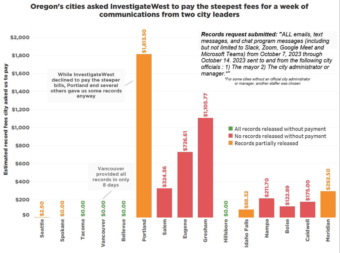 Of the nine other cities InvestigateWest sent similar records requests to in Oregon and Idaho, only one — Hillsboro, Oregon — was willing to fully waive the fees. InvestigateWest didn’t pay the fees — and therefore, was not able to get all the requested records.