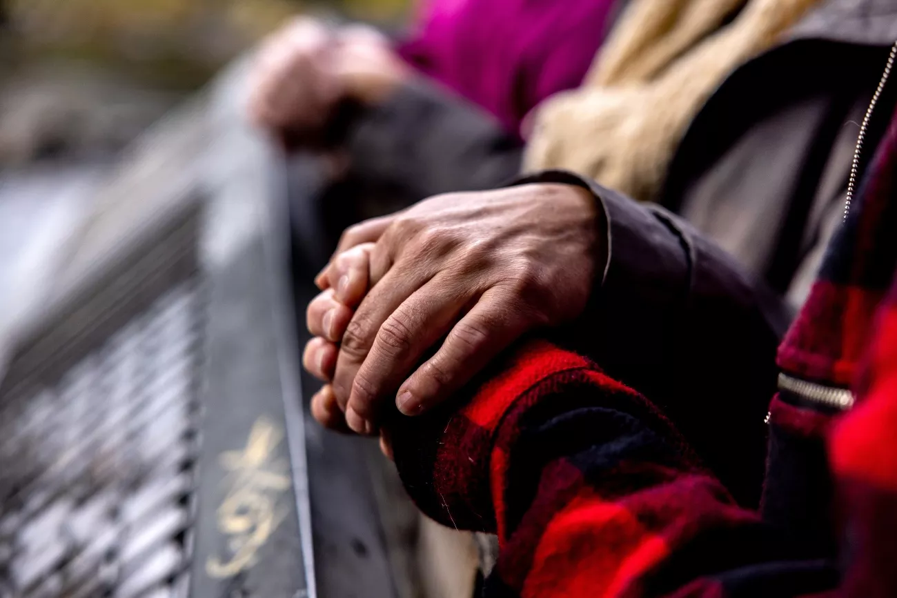 Sharilyn Lux holds hands with friends Peggy Shepard and Cris Coffing while visiting the lower viewing platform at Snoqualmie Falls, a place where Lux finds solace. Credit: Mike Kane/InvestigateWest