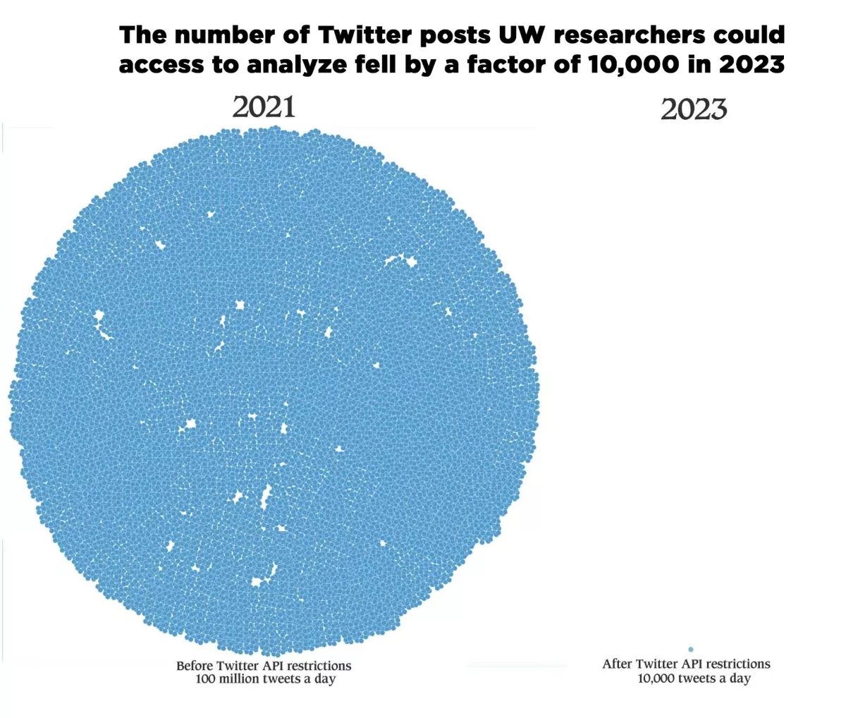 Three years ago, the UW was able to download 100 million Twitter posts a day. Today, unless they want to pay a fortune, they’re limited to downloading about 10,000 tweets a day.