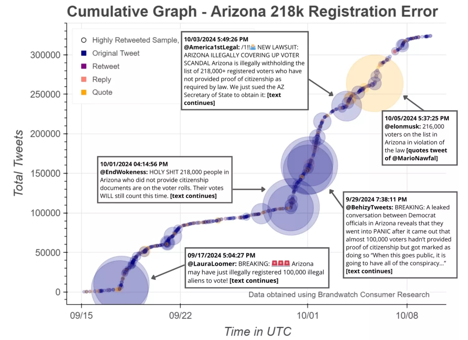 Schafer and other team members still work to create charts tracking how rumors spread on X. One chart that focused on rumors about illegal voting in Arizona tracked how each time a big conservative account reacted to the story, it would create a boom of reactions. A tweet from Laura Loomer, a 9/11 conspiracy theorist, about “100,000 illegal aliens” potentially voting triggered one spike of discussion in mid-September. Then came another major spike from a tweet from an account called “EndWokeness” in early October. Finally, Musk himself shared the story, triggering the last big burst of activity.