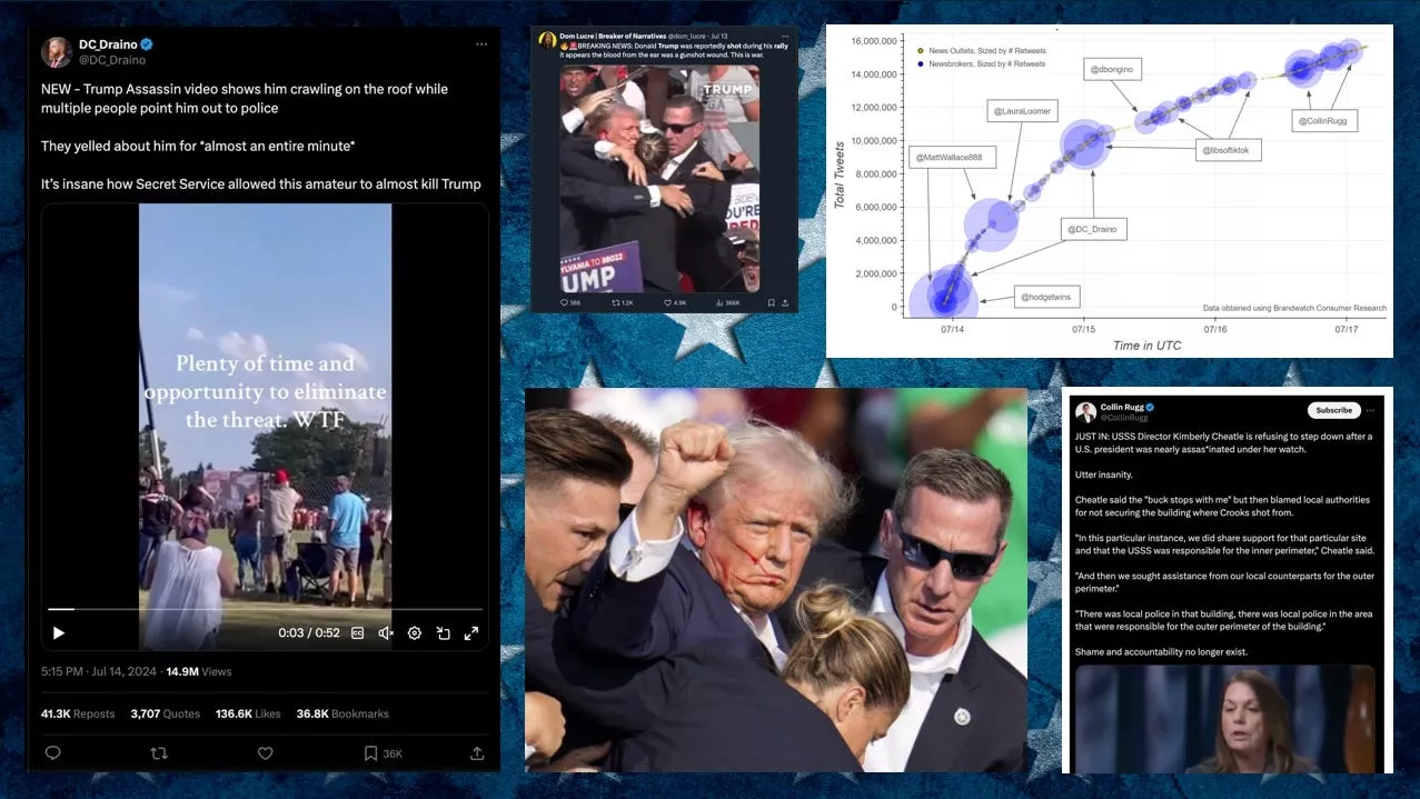 A collage from the University of Washington’s Center for an Informed Public illustrates the ways that information — and misinformation — about the shooting of former President Donald Trump traveled online. Credit: UW