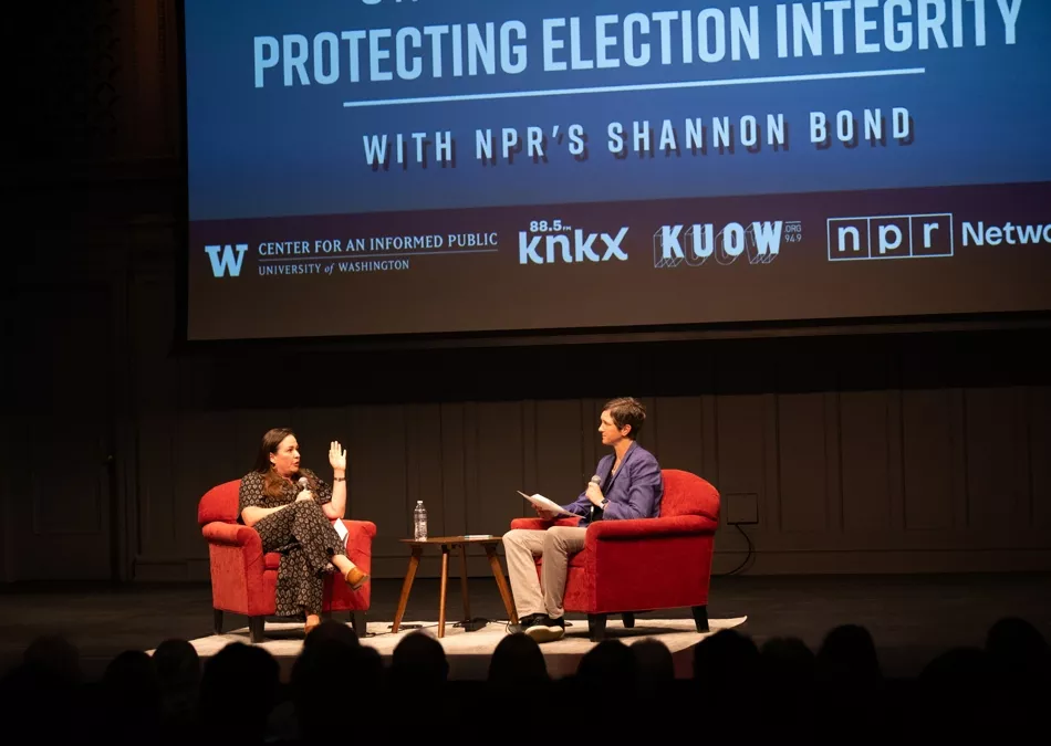 Kate Starbird, right, co-founder of the UW’s Center for an Informed Public, speaks at Town Hall Seattle in September with NPR’s Shannon Bond. Credit: UW