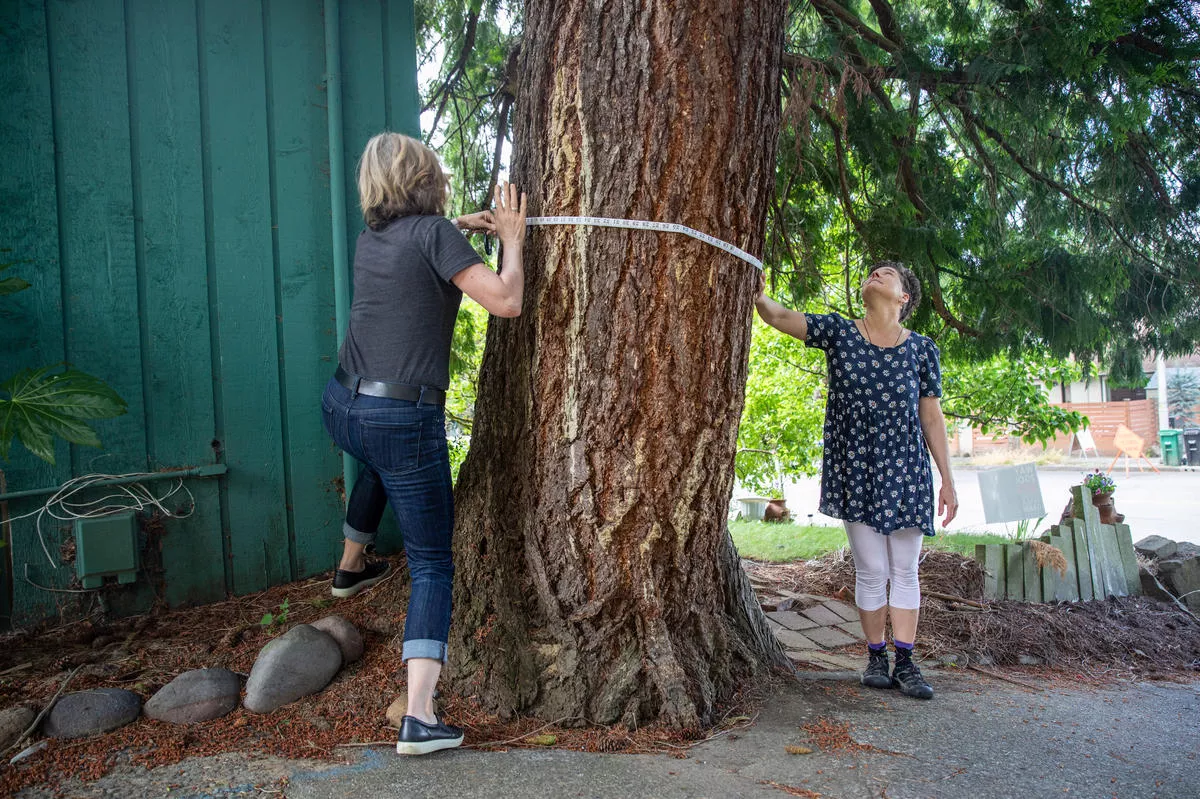 Sandy Shettler, left, and Rivers Dysart measure the decades old trees in Seattle’s far northeast corner. Each trunk of the Meadowbrook's True-Love trees stretches more than 40 inches, earning the title “exceptional tree” due to their size by the city. Credit: Lizz Giordano/Cascade PBS