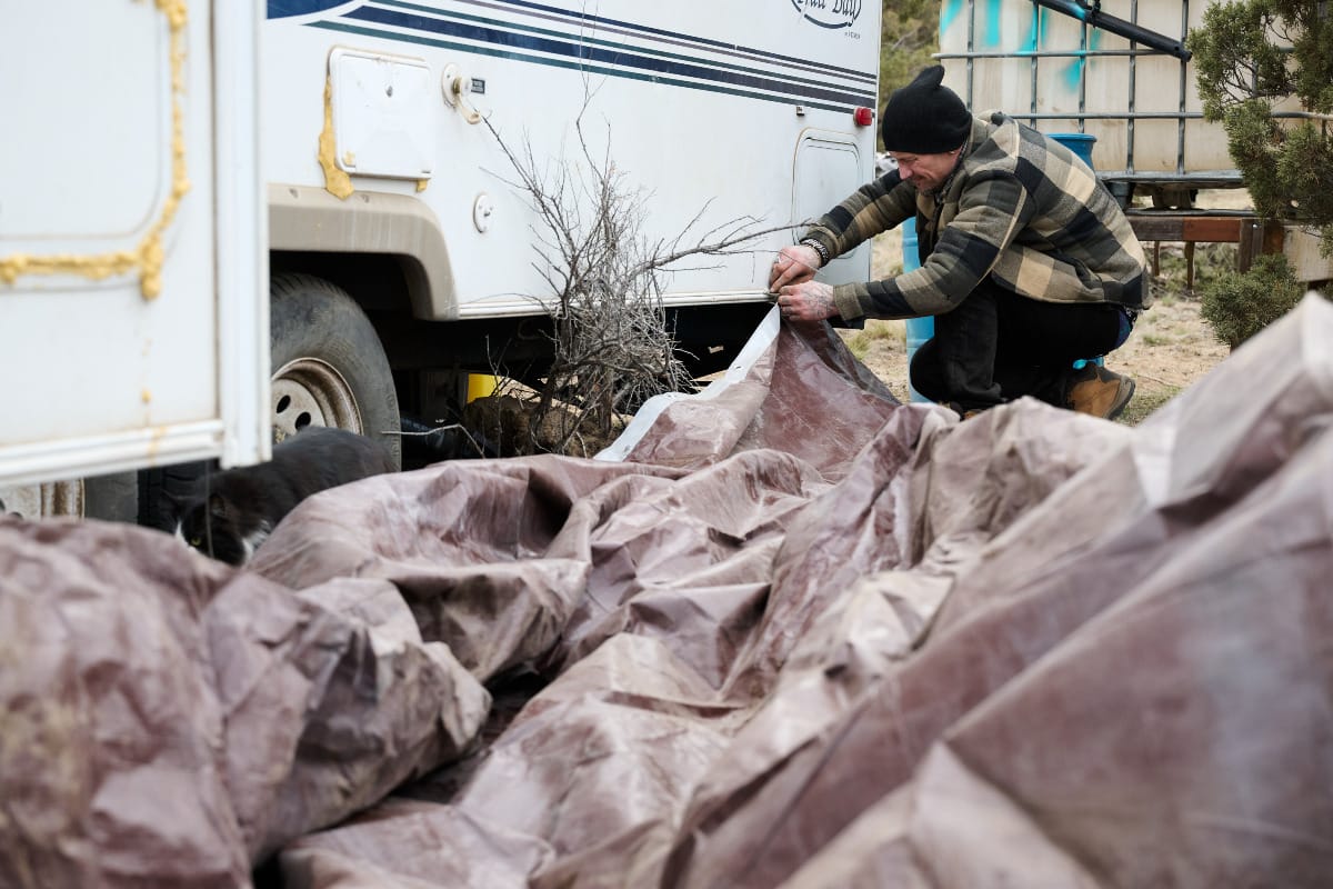 Richard Owens covers the bottom of his RV with a tarp at Juniper Ridge, a sanctioned camp site for homeless individuals outside Bend, Oregon, where he now lives with is dog, Dexter. Owens relocated to Juniper Ridge after he was evicted from the China Hat encampment. “It’s not the lifestyle I would choose,” Owens said. Owens said he lost his job as a painter because his employer, who had arranged for him to be picked up from China Hat to work, did not want to provide transportation from Juniper Ridge.