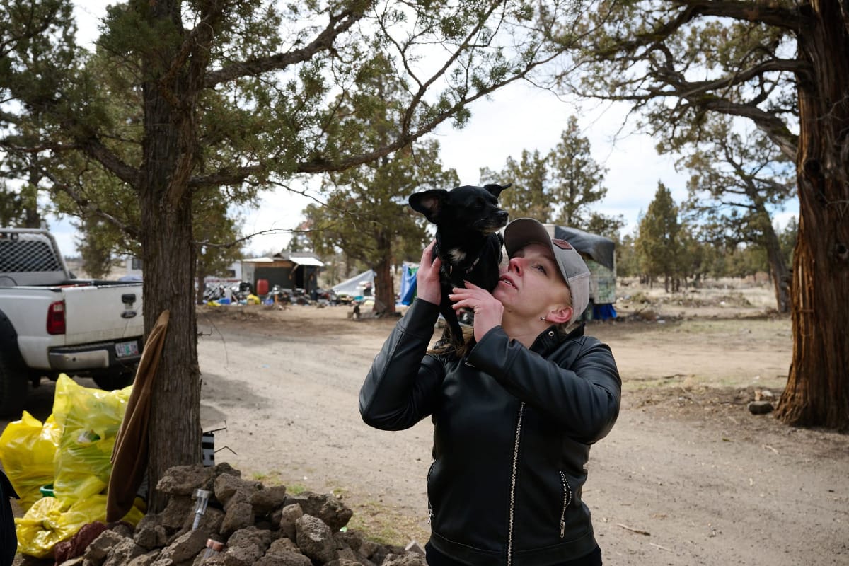 Mandy Bryant holds her dog, Dude, while visiting with people camped at the Juniper Ridge sanctioned campsite outside Bend, Oregon. Bryant lived at the China Hat encampment until it was closed by the U.S. Forest Service in May 2025 and helped other residents of the encampment relocate. (Joe Kline/FORJournalism)