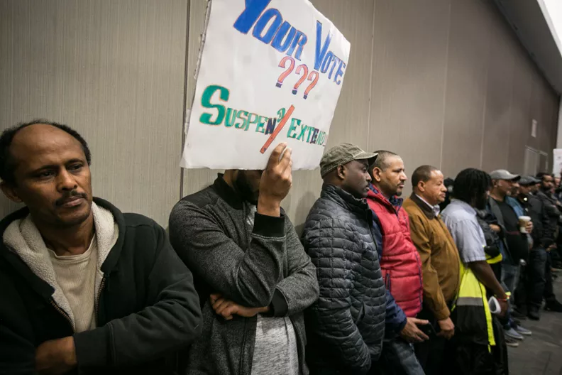 Several hundred drivers staged a walkout Tuesday in order to attend the port commissioners’ meeting, a crowd large enough that it filled the main meeting room at Seattle Tacoma International Airport and spilled out into the hallway. Dozens more filed into a second viewing room set up by port officials to allow drivers to watch the meeting remotely.