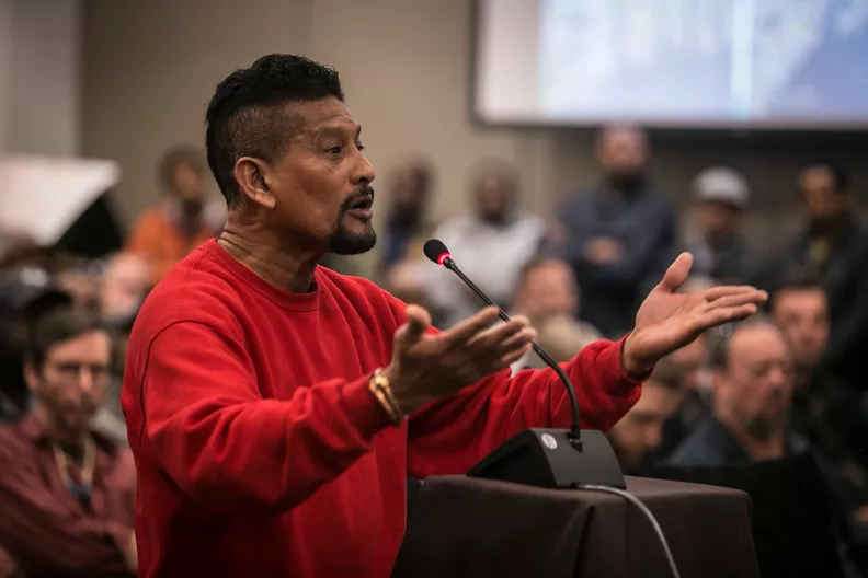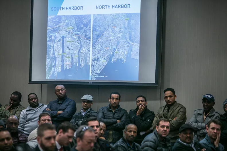 In fact, the port officials don't even know exactly how many truck drivers are affected. The ports say 53 percent of the approximately 4,500 trucks registered to do business at the ports comply with the clean-air rules. Driver Yared Meconnen, who helped organize the walkout and lobbying campaign, told port commissioners that more than 2,000 drivers still own the older trucks.