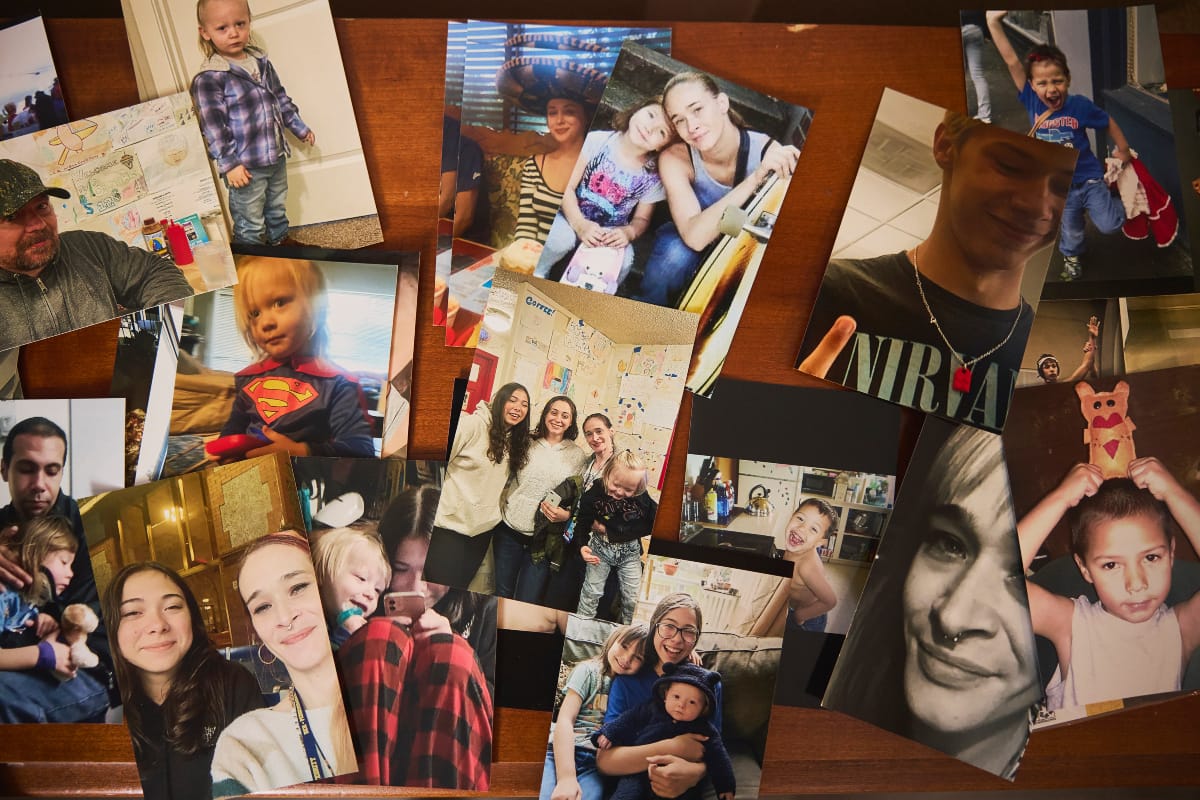 On the left are family photos that Sarah Bovee, an Oregon City, Oregon, mother in recovery, set out to decorate her home. Bovee, pictured on the right with her 4-year-old son Ryan at their home in Oregon City, Oregon, says support from knowledgeable, understanding health care providers helped her rebuild relationships with her other three children and successfully recover from a relapse during her pregnancy with Ryan. (Leah Nash/InvestigateWest)