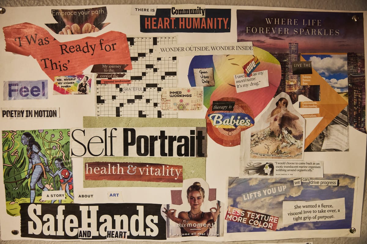 A vision board (left) and other recent artwork by Sarah Bovee, an Oregon City, Oregon mom in recovery. (Leah Nash/InvestigateWest)
