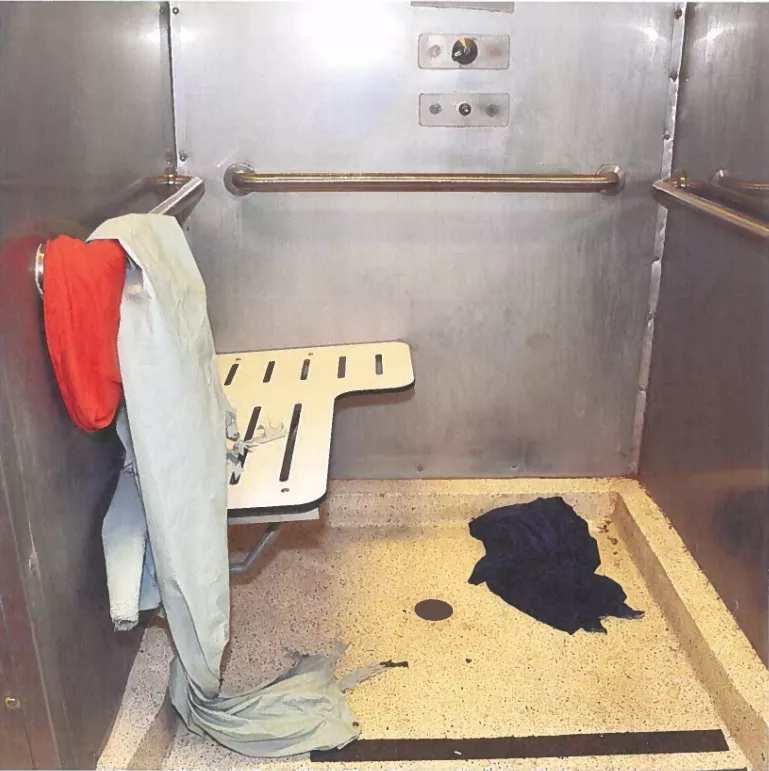 The Canyon County jail shower were Riley died is seen in evidence photos taken by investigators. Riley's shirt is hanging on the handrail next to the shower curtain. And the towel he used to conceal his knotted sheet is on the floor. Credit: Canyon County