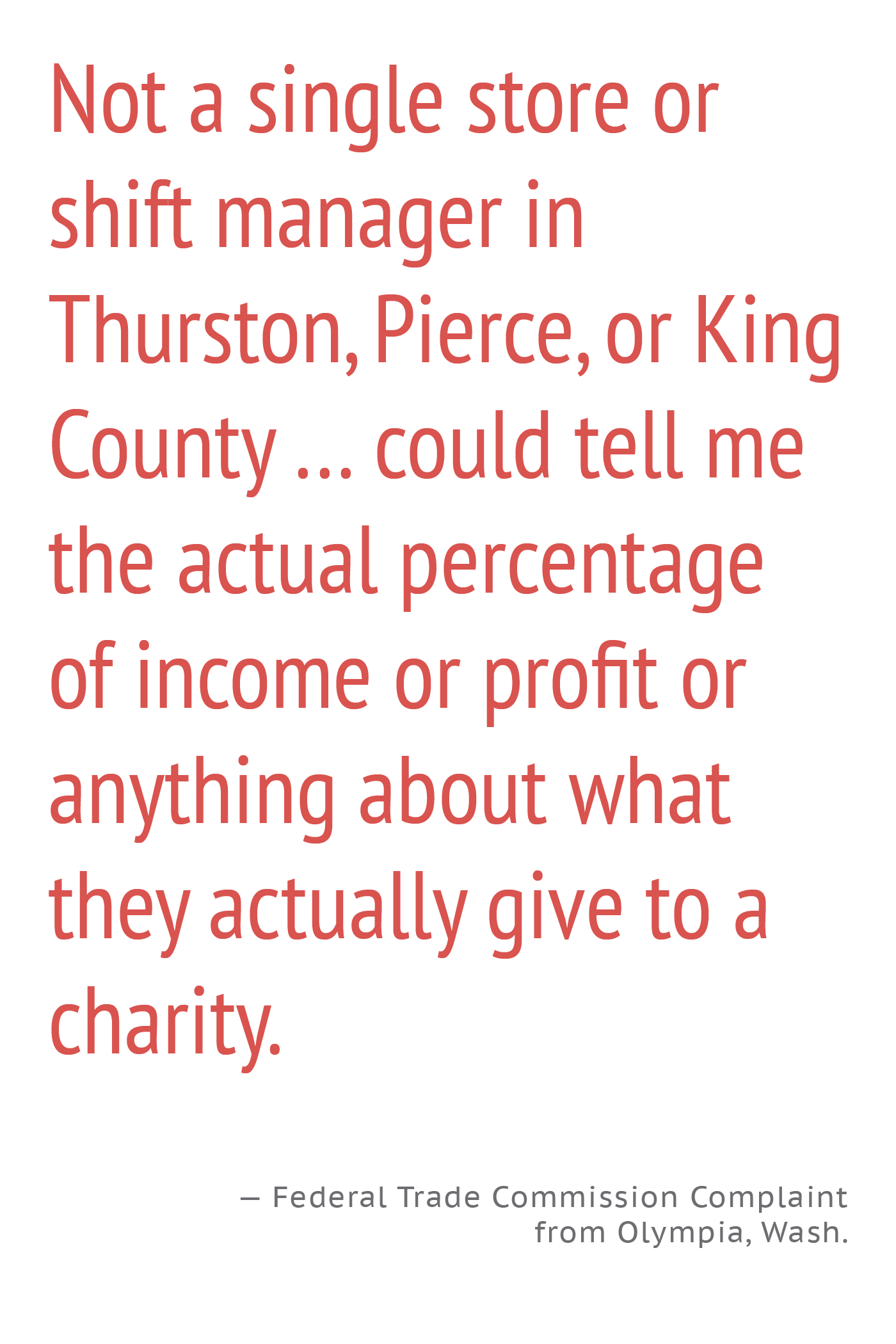 On brochures distributed at retail stores: “We partner with local nonprofits and pay them for all the goods donated at our stores.”