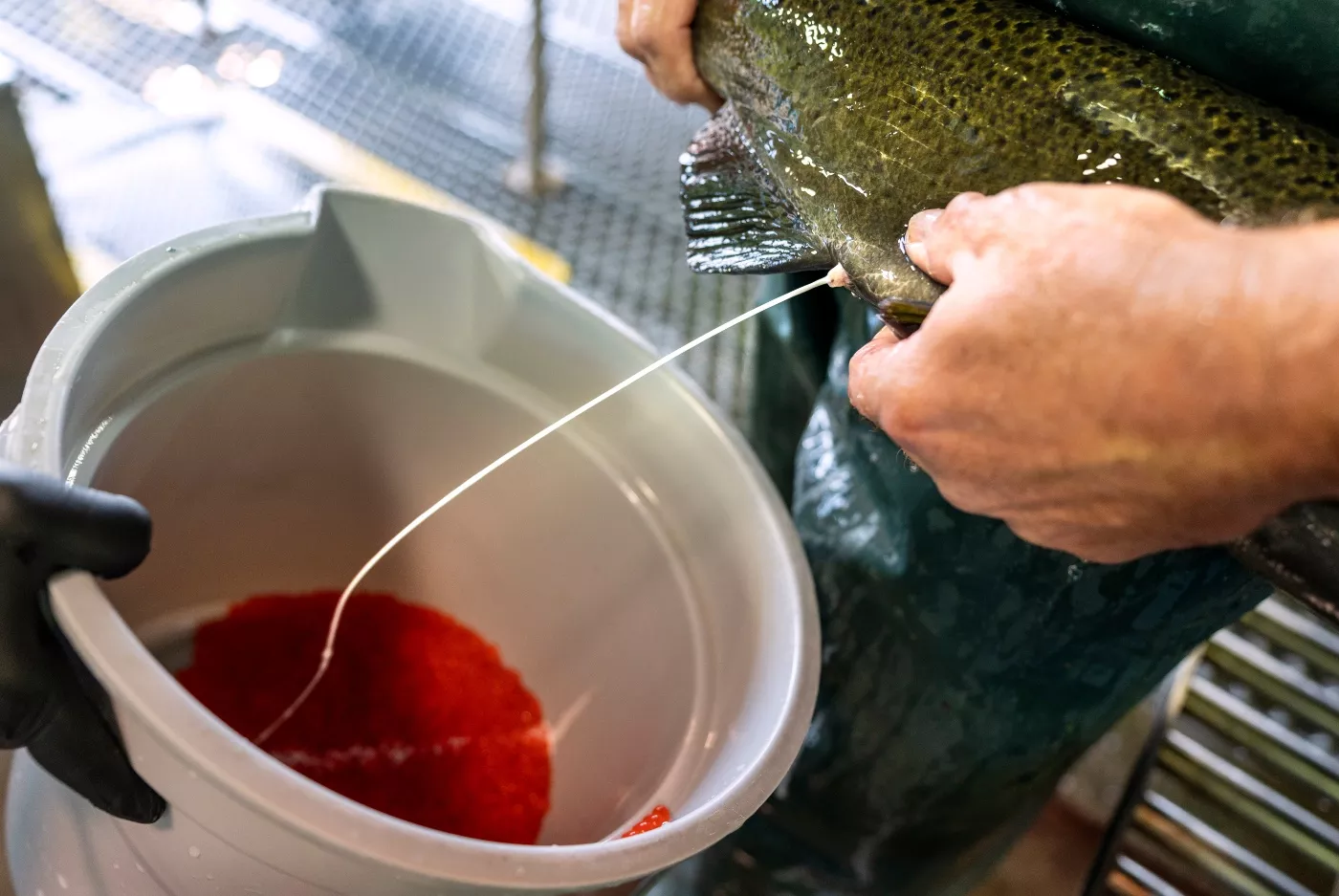 Hoses hanging from steel girders flushed blood through the grated metal floor. Hatchery workers in splattered chest waders gutted globs of bright orange eggs from the dead females and dropped them into buckets, then doused them first with a stream of sperm taken from the dead males and then with an iodine disinfectant.