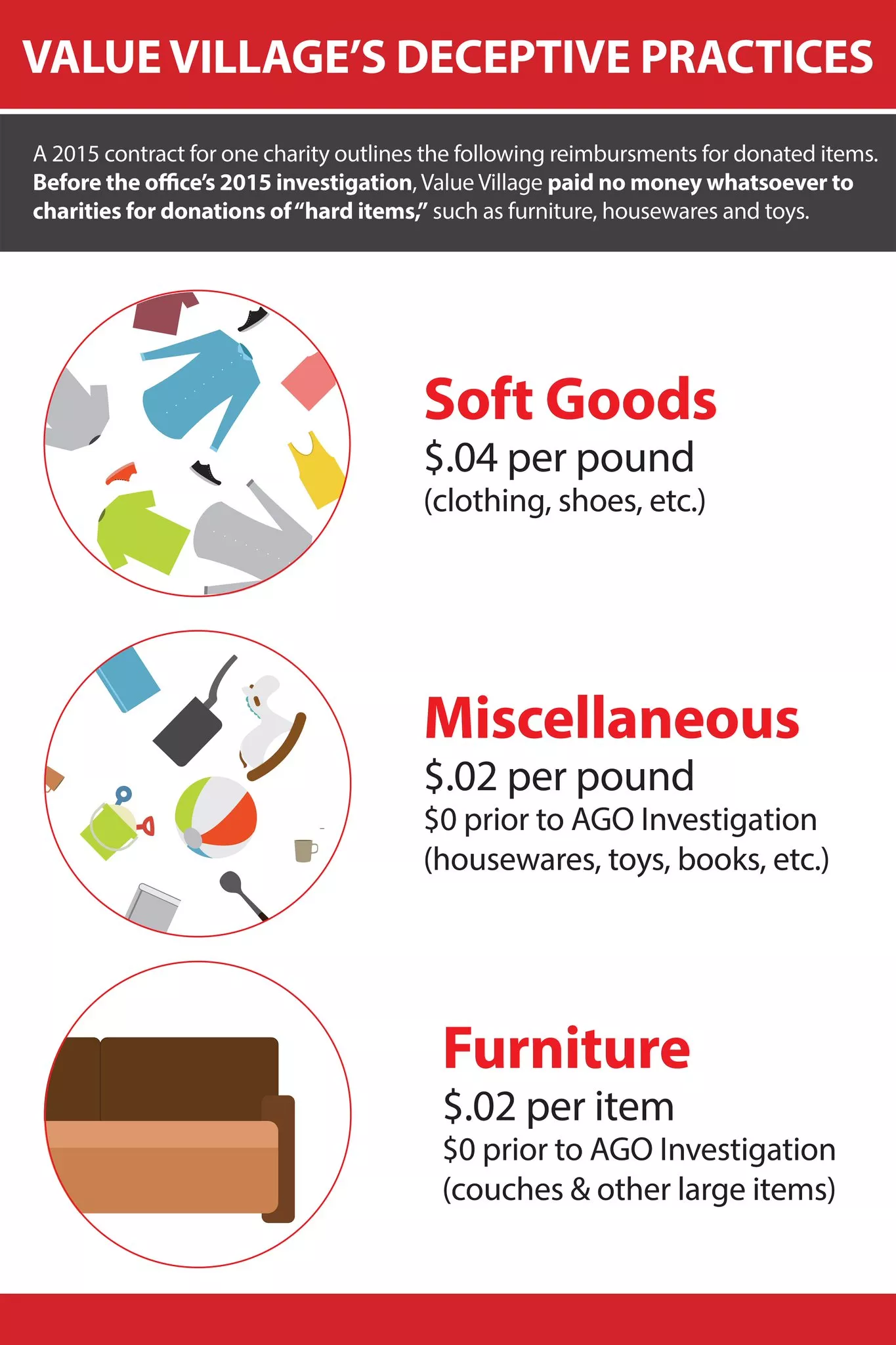 Value Village recently started paying charities a small amount – “several cents per piece of furniture or household item” – on donated hard goods. That’s far less value than what donors and consumers would expect for such items, the state says.